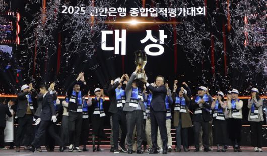 지난 17일 인천광역시 중구 소재 인스파이어 엔터테인먼트 리조트 아레나에서 개최한 ‘2025년 종합업적평가대회’에서 정상혁 신한은행장(가운데 오른쪽)과 박현종 센터장(가운데 왼쪽)이 챔피언 트로피를 들어올리는 모습 [사진: 신한은행] |