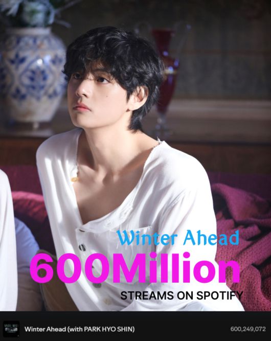 지난 17일 세계 최대 음원 플랫폼 스포티파이에 따르면 뷔가 박효신과 협업한 '윈터 어헤드'(Winter Ahead(with Park Hyoshin))는 6억 스트림 고지를 넘겼다. 글로벌 차트에서는 367일 차트인을 이어가고 있다.