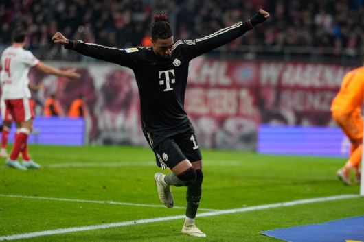 [라이프치히=AP/뉴시스] 바이에른 뮌헨의 마이클 올리세가 17일(현지 시간) 독일 라이프치히의 레드불 아레나에서 열린 2025-26 분데스리가 18라운드 라이프치히와 경기 후반 43분 팀 5번째 골을 넣고 세리머니하고 있다. 올리세는 1골 3도움을 기록하며 팀의 5-1 승리를 이끌었다. 2026.01.18.