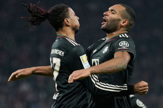 [라이프치히=AP/뉴시스] 바이에른 뮌헨의 마이클 올리세(오른쪽)가 17일(현지 시간) 독일 라이프치히의 레드불 아레나에서 열린 2025-26 분데스리가 18라운드 라이프치히와 경기 후반 37분 요나탄 타의 골에 도움을 기록한 후 함께 환호하고 있다. 올리세는 1골 3도움을 기록하며 팀의 5-1 승리를 이끌었다. 2026.01.18.