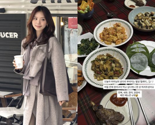사진 속에는 김지영을 위해 준비된 푸짐한 한 상 차림이 담겨 있다. "어머님이 밥상"이라면서 결혼을 앞둔 예비 신부를 위한 시어머니가 준비한 밥상이었다.