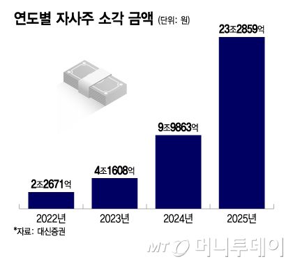 자사주 소각은 기업가치 제고 프로그램이 시행된 2023년 4조2000억원으로 전년대비 2배 가까이 증가한 후 2024년 10조원, 지난해 23조3000억원으로 급증하는 추세를 보이고 있다.