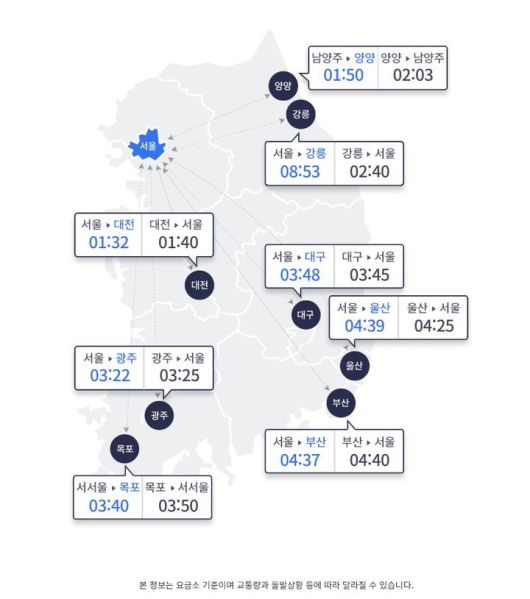 상행선은 ▲부산~서울 4시간40분 ▲대구~서울 3시간45분 ▲광주~서울 3시간25분 ▲대전~서울 1시간40분 ▲강릉~서울 2시간40분 ▲울산~서울 4시간25분 ▲목포~서서울 3시간50분이다.
