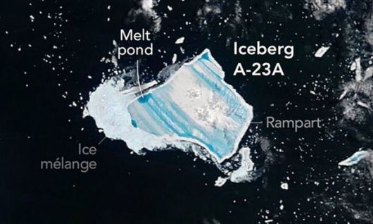 미국항공우주국(나사) 지구관측소가 1986년 남극 필히너빙붕에서 떨어져 나온 빙산 A-23A의 최근 모습을 촬영한 사진을 공개했다.