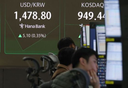 14일 서울 중구 하나은행 본점 딜링룸에서 직원이 증시와 환율을 모니터하고 있다. 이날 원/달러 환율은 일본 엔화 약세 속에 열흘째 상승세를 지속하며 1,480원에 바짝 다가섰다. 이날 서울 외환시장에서 미국 달러화 대비 원화 환율은 오전 9시5분 현재 전날 주간 거래 종가(오후 3시30분 기준)보다 4.6원 오른 1,478.3원이다. 2026.1.14 조용준 기자 |