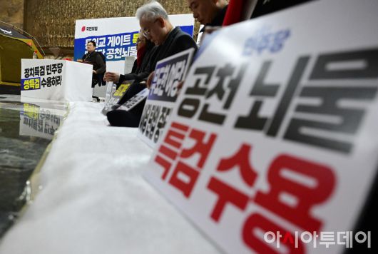 아시아투데이 이병화 기자 = 장동혁 국민의힘 대표가 18일 국회 로텐더홀에서 '더불어민주당의 공천 뇌물·통일교 게이트 특검 수용'을 촉구하며 단식농성을 4일째 이어가고 있는 가운데 장 대표를 응원하는 꽃바구니가 놓여 있다. ⓒ "젊은 파워, 모바일 넘버원 아시아투데이"