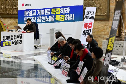아시아투데이 이병화 기자 = 장동혁 국민의힘 대표가 18일 국회 로텐더홀에서 '더불어민주당의 공천 뇌물·통일교 게이트 특검 수용'을 촉구하며 단식농성을 4일째 이어가고 있다.