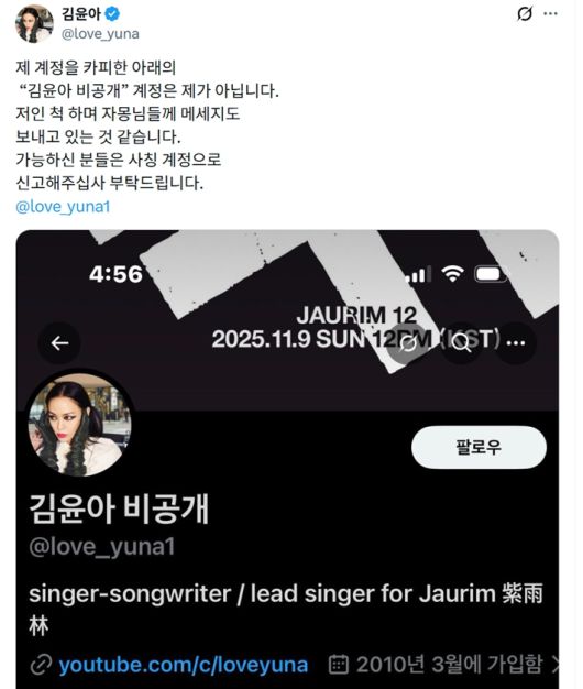 밴드 자우림(JAURIM) 김윤아가 트위터(X)에서 자신을 사칭하는 계정이 있다며 주의를 당부했다.