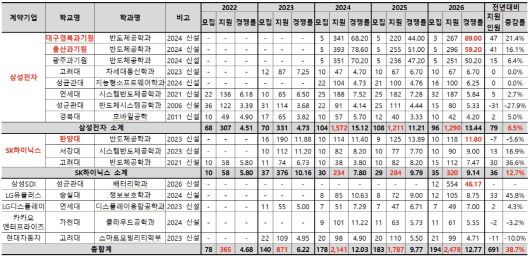 기업별로 보면 삼성전자 계약학과 전체 지원자수는 1290명으로 전년 대비 6.5% 증가했다. SK하이닉스 계약학과 지원자수는 320명으로 전년 대비 12.7% 늘었다.