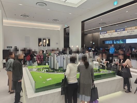 서울의 한 아파트 견본주택을 찾은 예비 청약자들이 단지 모형도를 살펴보고 있는 모습./전원준 기자 |