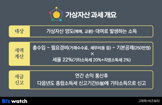 코인 매매차익은 기타소득으로 분류돼 22%(지방소득세 2% 포함) 세율이 적용된다. 소득금액은 양도가액에서 취득가액, 거래 수수료 등 부대비용을 차감해 계산한다. 차익에 대한 기본공제는 연 250만원이다.