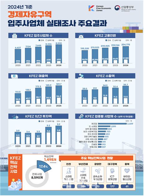 산업통상부가 18일 발표한 ‘2024년 기준 경제자유구역 입주사업체 실태조사’에 따르면, 경제자유구역 내 입주사업체 수는 총 8590개로 전년 대비 4.4% 증가했다. 2017년~2024년 기간 동안 입주사업체 연평균 증가율은 7.3%에 달한다.