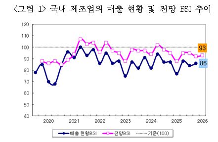 2026년 연간 매출 전망 BSI는 95로 지난해 전망치(91) 대비 4포인트 올랐지만 여전히 기준선을 하회한다.