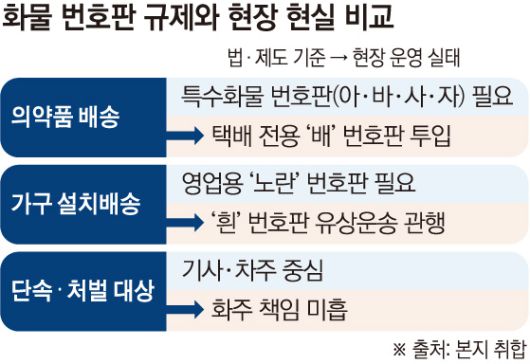 이 같은 편법 운송은 기사 개인의 일탈을 넘어 산업 전반의 운영 방식으로 굳어지고 있다. 합법적으로 영업용 번호판을 확보한 운송사업자들이 오히려 가격 경쟁에서 밀리는 역차별 구조도 형성됐다. 문제의 본질은 업종별 불법 사례가 아니라 제도와 집행의 괴리라는 지적도 나온다. 번호판 규제는 택배와 일반 화물을 이분법적으로 구분하는 구조에 머물러 있어 시장 변화를 따라가지 못하고 있다는 비판이다.