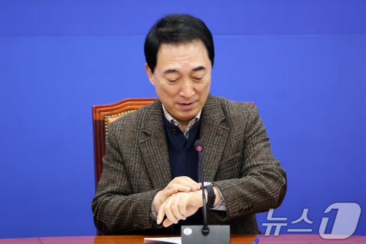 (서울=뉴스1) 이승배 기자 = 박수현 더불어민주당 수석대변인이 18일 서울 여의도 국회에서 열린 현안 기자간담회에 참석해 시계를 보고 있다. 2026.1.18/뉴스1photolee@news1.krCopyright ⓒ 뉴스1. All rights reserved. 무단 전재 및 재배포, AI학습 이용 금지.