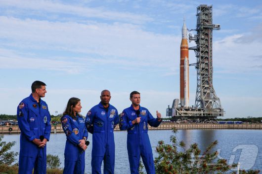 17일(현지시간) 미 항공우주국(NASA)의 차세대 달 로켓인 스페이스 발사 시스템(SLS) 로켓과 오리온 유인 캡슐을 플로리다주 케네디 우주센터 발사대로 이동시키는 현장에서 '아르테미스 Ⅱ' 임무의 사령관 리드 와이즈먼이 우주비행사 빅터 글로버, 크리스티나 코크, 제러미 핸슨과 함께 발언하고 있다. 2026.01.17. ⓒ 로이터=뉴스1 ⓒ News1 윤다정 기자 |