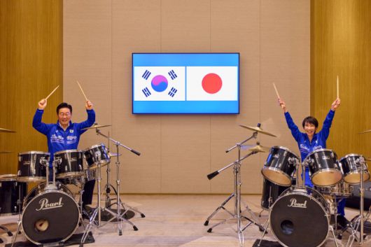 이재명 대통령과 다카이치 사나에 일본 총리가 13일 일본 나라현에서 정상회담 후 환담장에서 드럼 합주를 하고 있다. 양 정상은 '케이팝 데몬 헌터스'의 주제가 '골든'과 BTS의 히트곡 '다이너마이트'에 맞춰 드럼을 함께 연주했다. 다카이치 총리는 학창 시절 헤비메탈 록밴드 드러머로 활동했다./연합뉴스 |