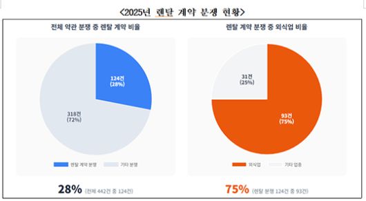 한국공정거래조정원에 설치된 약관분쟁조정협의회는 2025년 처리한 분쟁조정 사건 442건을 분석한 결과, 렌탈 계약 관련 분쟁이 28%(124건)를 차지했다고 18일 밝혔다. 이 중 약 75%인 93건이 외식업 분야에서 발생했다.