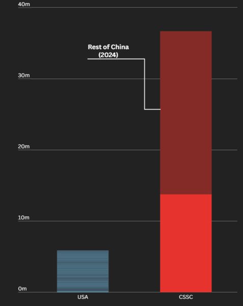 현재 중국에는 300개가 넘는 조선소가 존재하며 매년 전 세계 상선의 절반을 생산하고 있다. 2024년에만 총 1400만톤의 선박을 찍어냈다. 그러나 같은 해 미국은 단 5척의 대형 상선을 생산했을 뿐이다. 극단적으로는 미국이 2차 세계대전 이후 건조한 모든 선박의 톤수를 합치더라도, 중국국영조선공사(CSSC)의 한 해 생산량을 넘지 못한다.