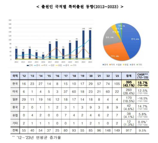 출원인 국적별로 살펴보면 한국에 이어 미국 28.4%(260건), 일본 18.5%(170건), 중국 4.6%(42건), 유럽연합 4.1%(38건) 순으로 기술 개발이 활발한 것으로 나타났다. 특허 출원 증가율은 우리나라에 이어 중국(14.7%), 미국(12.5%), 유럽연합(5.8%), 일본(19.8% 감소) 순으로 집계됐다.