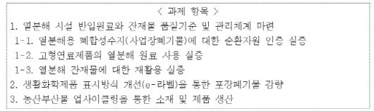 그 밖에 생활화학제품 표시방식 개선을 통한 포장폐기물 감량과 농산부산물 새활용(업사이클링)을 통한 소재 및 제품 생산 과제도 추진한다.