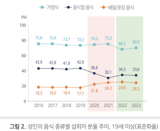 반면 음식점에서 하루 한 끼 이상을 식사한 비율은 2016년 42.9%에서 2023년 33.6%로 감소했다. 2016~2019년 사이 42% 안팎에서 큰 변화가 없었으나, 2020년 36.6%, 2021년에 30.1%까지 떨어진 뒤 반등해 2022년 34.2%, 2023년 33.6%를 기록했으나 코로나19 유행 전보다는 크게 낮다.