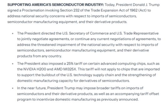 미국 정부는 14일(현지시각) 해외에서 만들어 미국을 거쳐 다른 국가로 판매하는 엔비디아 'H200'과 AMD 'MI325X'에 수입 관세 25%를 매기로 했다. 무역확장법 232조에 따른 조치다. H200과 MI325X 중국 공급을 겨냥한 조치다.