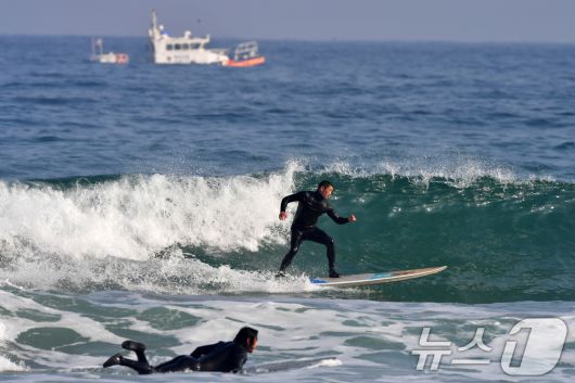 (포항=뉴스1) 최창호 기자 = 18일 경북 포항시 북구 흥해읍 용한리 해수욕장에서 서퍼들이 겨울 파도를 타고 있는 가운데 포항해양경찰서 연안구조정이 연안 순찰을 하고 있다. 2026.1.18/뉴스1choi119@news1.krCopyright ⓒ 뉴스1. All rights reserved. 무단 전재 및 재배포, AI학습 이용 금지.
