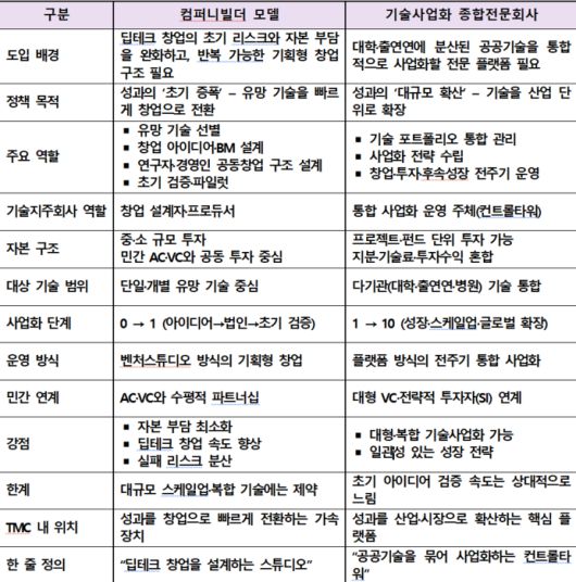 컴퍼니빌더 모델과 기술사업화 종합전문회사는 이러한 글로벌 벤처스튜디오 모델을 한국의 공공기술 환경에 맞게 제도화한 시도로 볼 수 있다.