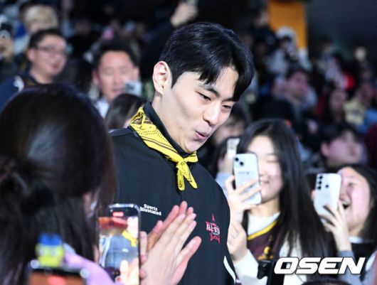 경기에 앞서 팀 브라운 유기상이 등장하며 팬들과 하이파이브를 하고 있다. 2026.01.18 /sunday@osen.co.kr