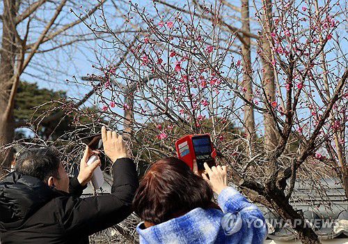 (강릉=연합뉴스) 유형재 기자 = 18일 강원 강릉시 초당동의 한 공원에서 관광객이 활짝 핀 홍매화를 카메라에 담고 있다. 2026.1.18 yoo21@yna.co.kr ▶제보는 카카오톡 okjebo▶연합뉴스 앱 지금 바로 다운받기~▶네이버 연합뉴스 채널 구독하기 <저작권자(c) 연합뉴스, 무단 전재-재배포, AI 학습 및 활용 금지><저작권자(c)연합뉴스. 무단전재-재배포금지.>
