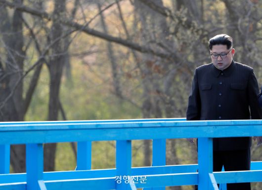 2018년 4월27일 김정은 국무위원장이 공동 식수를 마친 후 군사분계선 표식물이 있는 ‘도보다리’까지 산책을 하며 담소를 나누고 있다. 2018.9.19 /평양사진공동취재단·서성일기자 |