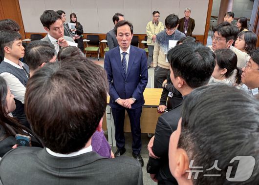 (서울=뉴스1) 이재명 기자 = 우상호 정무수석이 18일 청와대 춘추관에서 사직 인사말을 마친 후 취재진 질문에 답변하고 있다. 청와대는 이날 브리핑을 통해 정무수석비서관으로 홍익표 전 더불어민주당 원내대표를 발탁했다고 밝혔다. 이재명 정부 초대 정무수석인 우상호 정무수석은 강원도지사 출마를 위해 사퇴한 것으로 알려졌다. 2026.1.18/뉴스1