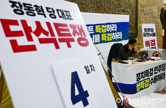 아시아투데이 이병화 기자 = 장동혁 국민의힘 대표가 18일 국회 로텐더홀에서 '더불어민주당의 공천 뇌물·통일교 게이트 특검 수용'을 촉구하며 단식농성을 4일째 이어가고 있다.