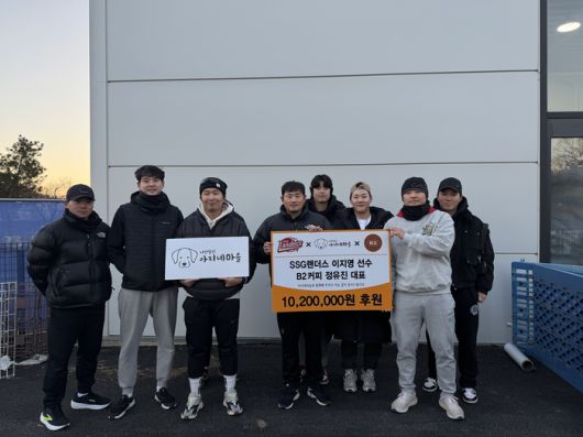 SSG 이지영이 최근 경기도 김포에 위치한 유기견 보호소 아지네 마을에서 봉사활동을 진행했다. 이번 봉사에는 SSG 조형우, 최준우, 한두솔, 최민준과 키움 김성민도 참여했다. 사진 | SSG 랜더스 |