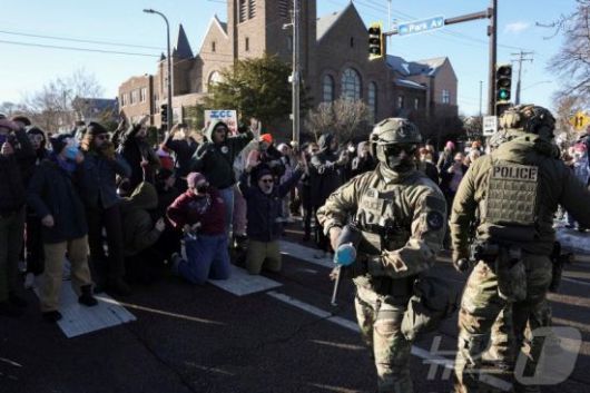 13일(현지시간) 미국 미네소타주 미니애폴리스에서 경찰과 시민들이 대치하고 있다. 일부 시민은 항의의 뜻으로 무릎을 꿇고 있다. 로이터연합뉴스 |