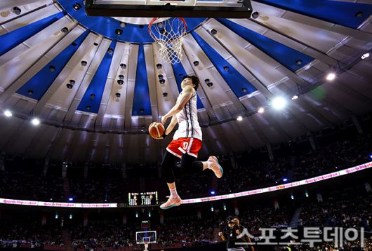 [스포츠투데이 팽현준 기자] 18일 서울 잠실실내체육관에서 열린 2025-2026 프로농구 올스타전에서 SK 김명진이 덩크 콘테스트에서 참가하고 있다. 2026.01.18. [스포츠투데이 팽현준 기자 sports@stoo.com]