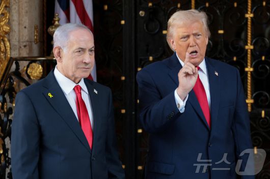 도널드 트럼프 미국 대통령이 29일(현지시간) 플로리다주 마러라고 리조트에서 베냐민 네타냐후 이스라엘 총리와 함께 취재진에게 말하고 있다. 2025.12.29 ⓒ 로이터=뉴스1 ⓒ News1 김경민 기자 |