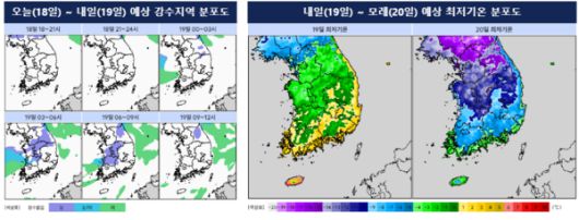 오늘(18일)은 중국 북동지방에 위치한 고기압의 영향권이나, 수도권과 강원도는 밤부터 기압골의 영향을 점차 받기 시작했다. 내일(19일)은 북쪽 비구름대가 거치고 중국 북부지방 고기압이 확장되며, 모레와 글피에는 찬 대륙고기압의 영향으로 전국에 강한 추위가 이어질 것으로 보인다.