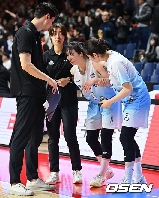 [OSEN=부산, 이석우 기자] 18일 부산 사직실내체육관에서 BNK금융 2025~2026 여자프로농구 부산 BNK와 인천 신한은행의 경기가 열렸다. 9연패에 빠졌던 신한은행 선수들이 2차 연장 끝에 85-79로 승리, 연패 탈출에 성공했다. 인천 신한은행 신이슬이 경기를 마치고 허리 통증을 호소하고 있다. 2026.01.18 / foto0307@osen.co.kr