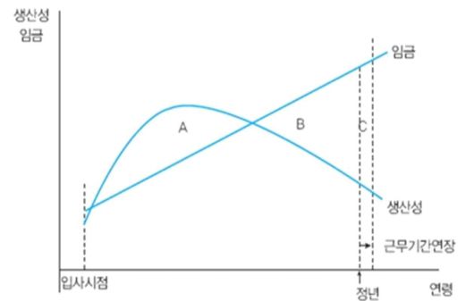 이 노무사는 "근로자의 일반적인 생산곡선과 연공급 하에 임금그래프를 살펴보면 숙련도와 생산성이 비례해서 증가하는 구간도 존재하고, 그렇지 않고 생산성과 상관없이 연공급 하에 근무기간에 비례해서 고임금이 지급되는 구간도 존재한다"며 "즉, A와 B가 같아지는 구간이 결국 정년인데, 기업입장에서 정년을 강제로 늘린다면 생산성과 무관하게 초과 지급되는 비용이 늘어나게 되어 손해라고 인식될 수밖에 없다"고 했다.