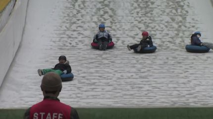 이곳의 슬라이드는 이렇게 눈 대신 얼음으로 만들어져 포근한 날씨에도 끄떡없습니다.