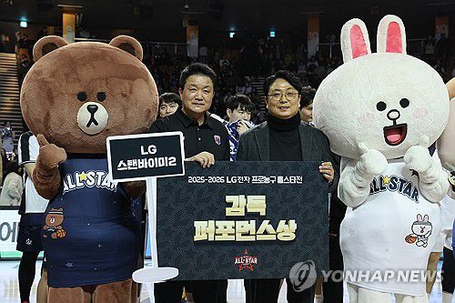(서울=연합뉴스) 박동주 기자 = 18일 서울 잠실실내체육관에서 열린 2025-2026 LG전자 프로농구 올스타전 팀 브라운과 팀 코니의 경기가 끝난 후 유도훈 감독이 감독 퍼포먼스 상을 받고 기념촬영하고 있다. 2026.1.18