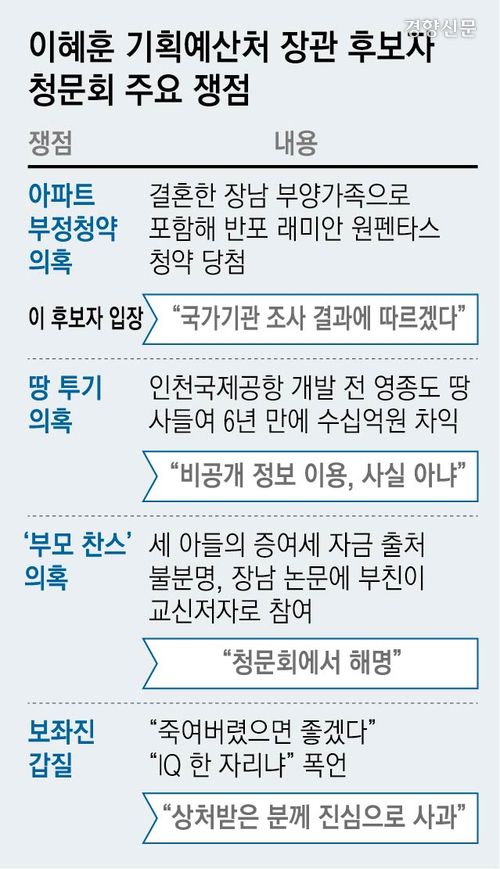 이 후보자는 과거 분양가 상한제를 비판해놓고 정작 자신은 래미안 원펜타스 ‘로또 청약’으로 수십억원대 시세차익을 얻어 ‘내로남불’ 논란에도 휩싸였다. 이 후보자는 국회 서면답변에서 “정책에 대한 비판과 법이 허용한 제도에 개인이 참여한 것은 구분돼야 한다”고 말했다.