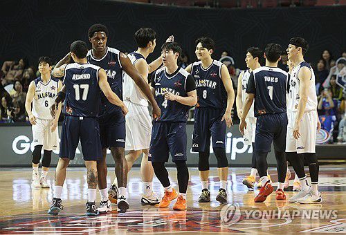 (서울=연합뉴스) 박동주 기자 = 18일 서울 잠실실내체육관에서 열린 2025-2026 LG전자 프로농구 올스타전 팀 브라운과 팀 코니의 경기에서 승리한 팀 브라운 선수들이 기뻐하고 있다. 2026.1.18