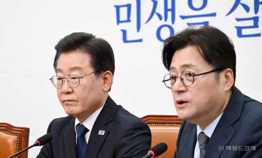 지난 2024년 4월 당시 이재명 더불어민주당 대표와 홍익표 원내대표의 모습. 이상섭 기자 |