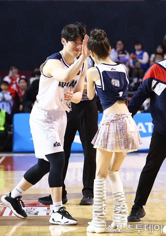 [스포츠투데이 팽현준 기자] 18일 서울 잠실실내체육관에서 열린 2025-2026 프로농구 올스타전에서 소노 이정현이 키키와 하이파이브를 하고 있다. 2026.01.18. [스포츠투데이 팽현준 기자 sports@stoo.com]