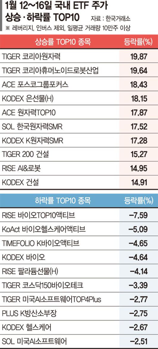 18일 한국거래소에 따르면 지난 12일부터 16일까지 가장 높은 수익률을 기록한 종목은 'TIGER 코리아원자력'으로 주간 19.87% 상승했다. 'ACE 원자력TOP10'(17.87%), 'SOL 한국원자력SMR'(17.52%), 'KODEX K원자력SMR'(17.28%) 등 원자력 관련 ETF가 상위권에 이름을 올렸다. 레버리지 및 인버스 종목과 일평균 거래량 10만주 미만 종목을 제외한 기준이다.