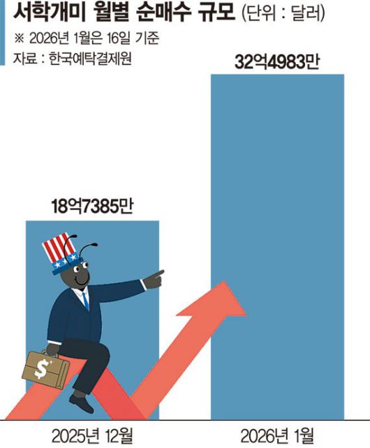 특히 최근 매수는 가격조정 구간에서 단기간 집중됐다. 올해 들어 코스피가 14% 넘게 상승한 반면, 미국 증시는 등락을 반복하며 상대적으로 제한적 흐름을 보이자 이를 매수 기회로 판단한 자금이 빠르게 유입됐다는 해석이 나온다.