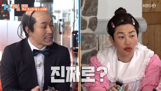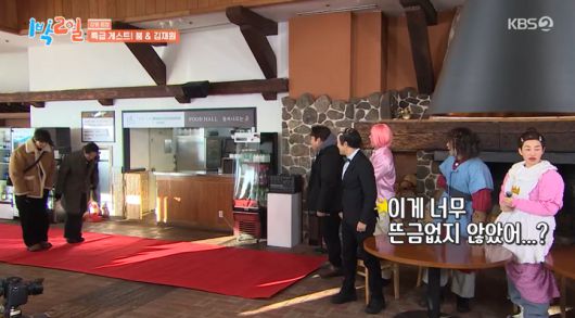 김종민은 "예능에선 (저처럼) 이런 분장도 해야 된다"라며 "할 수 있냐"고 김재원을 몰아붙였다. 딘딘은 "오늘 게스트 운이 최악이다"라며 "오늘 유독 추운 날이다"라고 말하며 고생길을 예고했다.